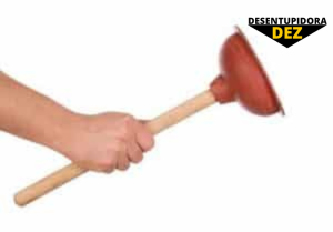 Desentupimento com desentupidor de borracha, pegue o desentupidor de borracha pressione sobre a saída da tubulação, fazendo movimentos de flexão para cima e para baixo até que seja liberada a passagem de água.